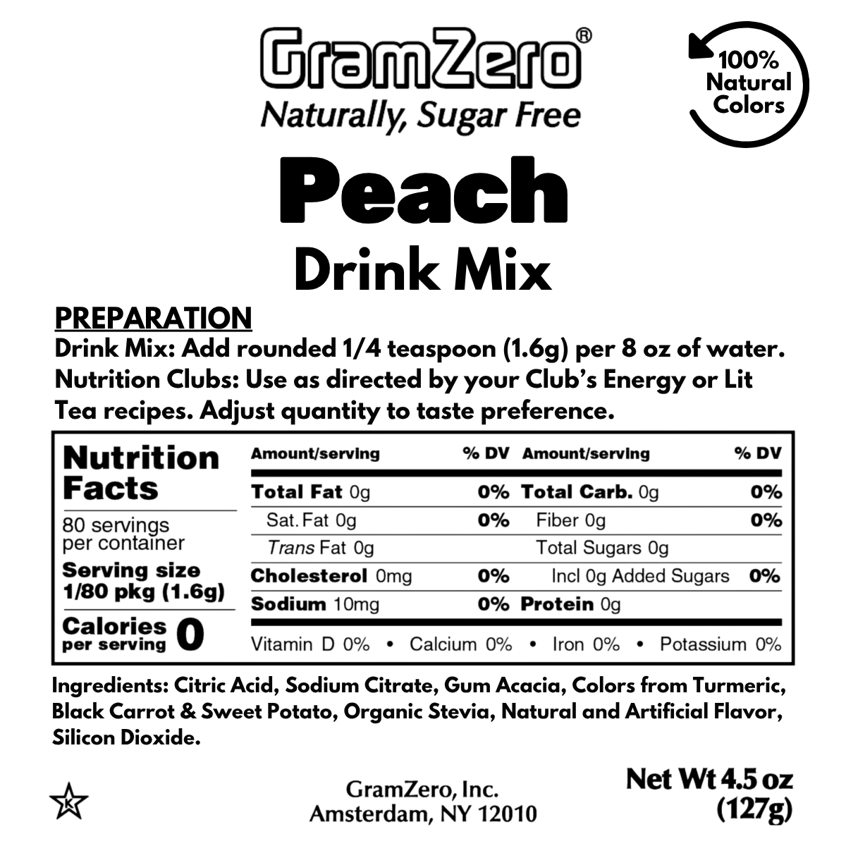 • Peach Natural Color Drink Mix Ingredients: Citric Acid, Sodium Citrate, Gum Acacia, Colors from Turmeric, Black Carrot & Sweet Potato, Organic Stevia, Natural and Artificial Flavor, Silicon Dioxide.